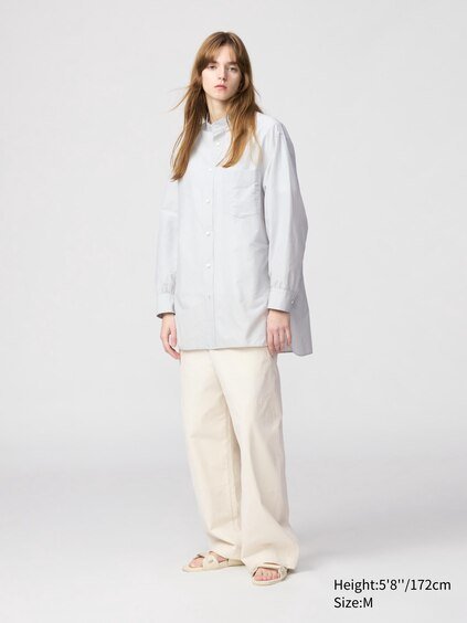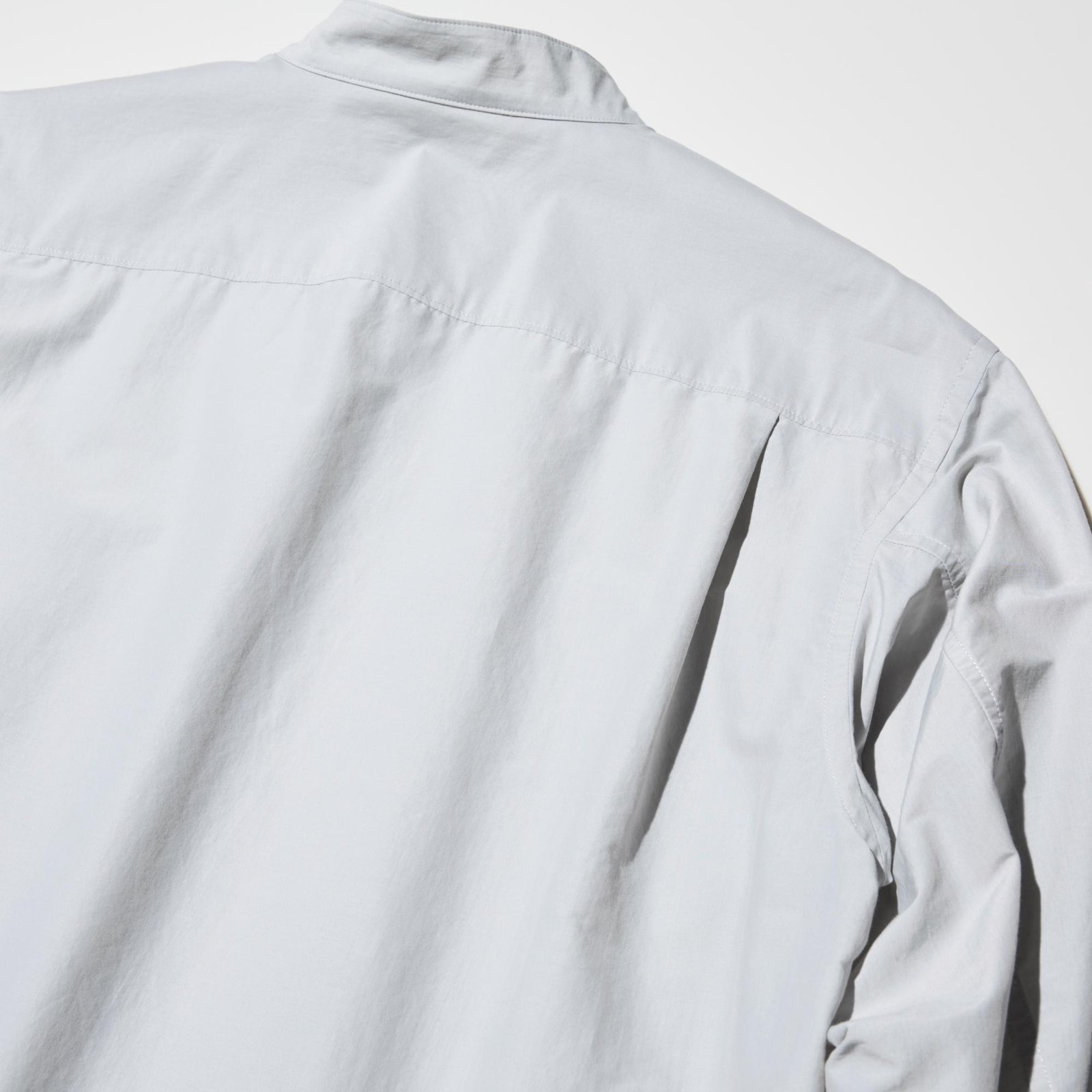 A loose-fitting stand collar shirt accented by a front placket and patch pockets.